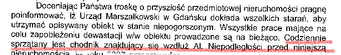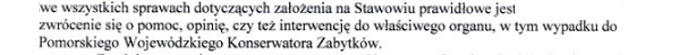 Informacja, podana w kolejnym akapicie pisma Pana Marszałka, że „w dniu 4 marca 2008 r. na terenie nieruchomości położonej w Sopocie przy Al. Niepodległości 618 przebywał Miejski Konserwator Zabytków z Sopotu, który nie stwierdził nieprawidłowości w zakresie dbania o niniejszą nieruchomość” brzmiałaby uspakajająco, gdyby nie wcześniejsze pismo przywołanej przez Pana Marszałka dr Danuty N. Zasławskiej, Konserwatora Zabytków Miasta Sopotu z 22 lutego 2008 roku, w którym wyraźnie zaznaczyła, iż Stawowie „pozostaje wyłącznie w gestii Pomorskiego Wojewódzkiego Konserwatora Zabytków”. |